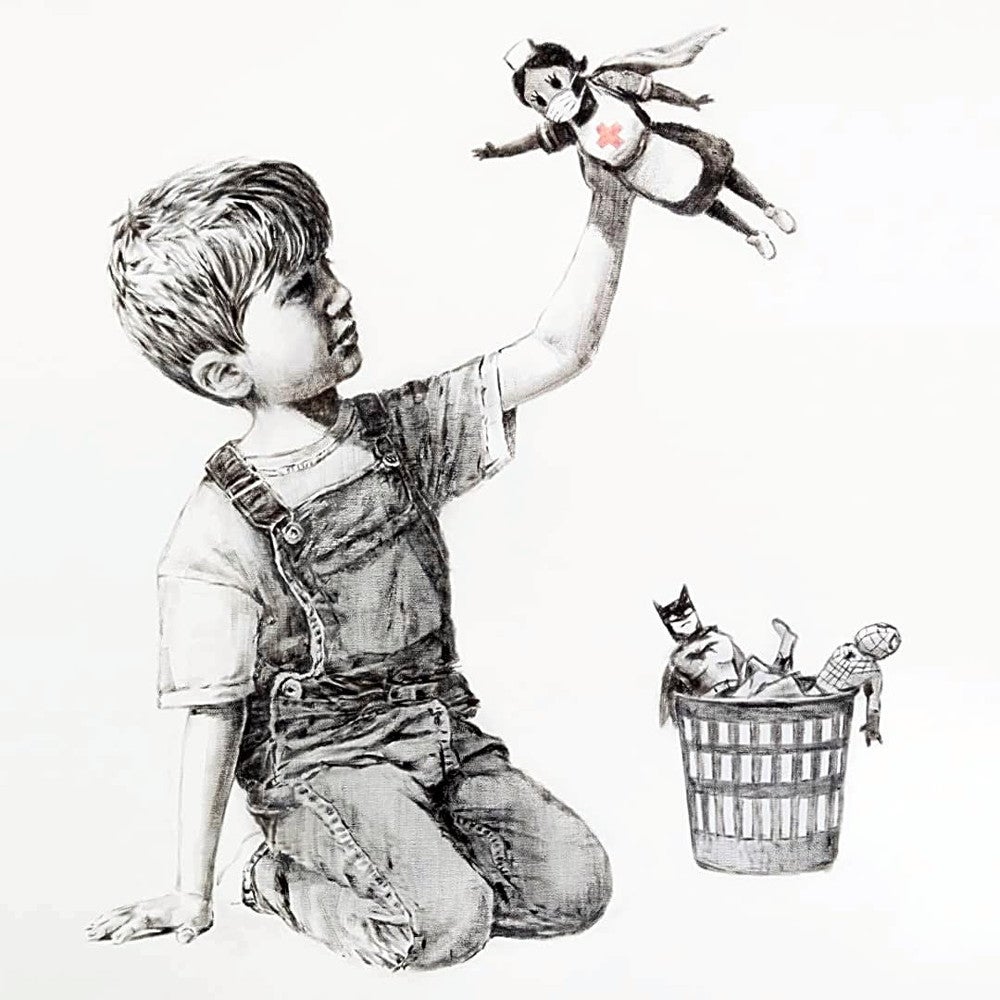 1平方メートルのキャンバスには、デニムとTシャツ姿の幼い男の子が、国民保健サービス(NHS)の看護師の人形をヒーローに見立てて遊ぶ様子が描かれている。